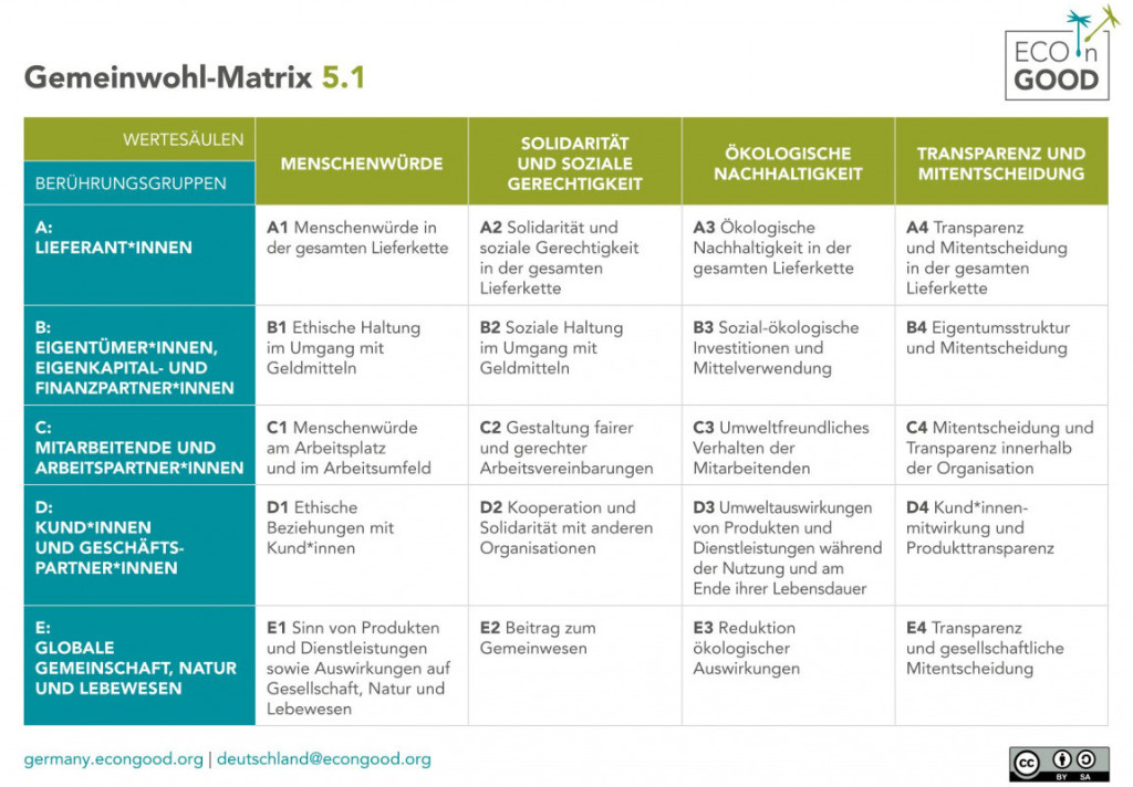 - Organisationsentwicklung: Schafft einen Überblick und Transparenz als Voraussetzung für strategische Innovationen und nachhaltige Entwicklung des Unternehmens. Wo wird bereits gemeinwohlorientiert gewirtschaftet und wo befinden sich noch Verbesserungspotenziale?