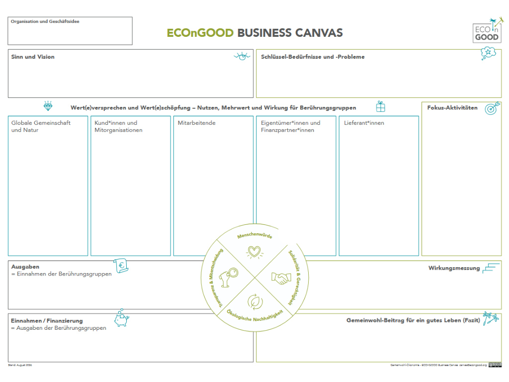 Das ECOnGOOD Business Canvas (EBC) zielt darauf ab, Organisationen in der Gründungsphase eine umfassende und wertebasierte Planung zu ermöglichen. Indem es im Vergleich zu “konventionellen” Geschäftsmodellen soziale, ökologische und demokratische Dimensionen in den Fokus einer Gründung rückt, unterstützt es euch von Anfang an euer Start-Up ganzheitlich gemeinwohlorientiert auszurichten.